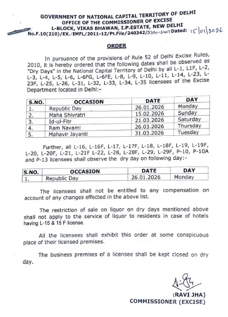 दिल्ली सरकार के एक्साइज विभाग की ओर से जारी आधिकारिक आदेश के अनुसार, जनवरी 2026 से मार्च 2026 की अवधि के लिए ड्राई डे की संशोधित सूची जारी की गई है। इस नई सूची में होली को शामिल नहीं किया गया है।